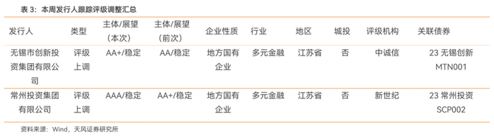 其中没有发行人评级被下调,2家发行人(无锡市创新投资集团有限公司、常州投资集团有限公司)评级被上调。