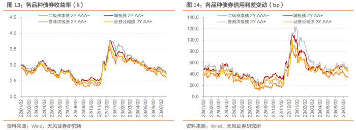证券公司债券收益率走势整体与中票走势一致性较高,但在市场调整过程中,会呈现出小幅差别。如2022年12月的调整中,券商次级债利差调整幅度略高于其他各类券种。