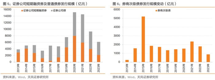 从一级市场发行来看,证券公司非次级债券的发行高峰在2020年和2021年,疫情影响下,资金面宽松,债券融资顺畅,证券公司短期融资券和普通债合计发行规模超过1万亿。