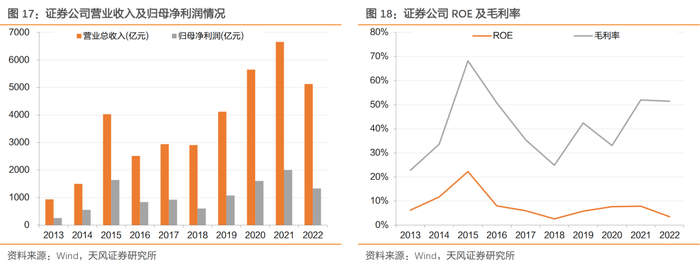 证券公司业绩表现不错。2019年-2021年,市场交易量放大、注册制推广等因素影响,证券公司利润持续增长;2022年以来,受股市调整等因素影响,营收和利润有所下滑,但仍呈现出不错的走势。