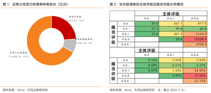 截止2023年7月21日,证券公司存续的债券合计规模2.48万亿,其中次级债5935.69亿元,占比24%;短期融资券2208亿元,占比9%;普通债16685.34亿元,占比67%。