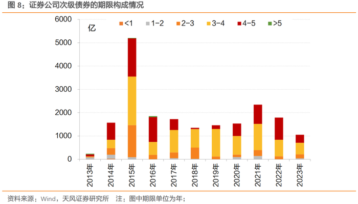 次级债的发行受监管政策的影响较大。2014年9月,中国证监会发布《关于鼓励证券公司进一步补充资本的通知》,补充资本的方向基本确立。2015年,证券公司发行的刺激债规模大幅增长,当年发行次级债规模超过5000亿元。但2016年开始,长期次级债不计入证券公司的核心净资本(仅计入附属资本),无法提高证券公司资本杠杆率,故证券公司发行次级债来满足净资本监管指标的动力减弱,因而此后,次级债发行逐步常态化,每年发行规模均在2000亿左右,净融资增量明显减少。