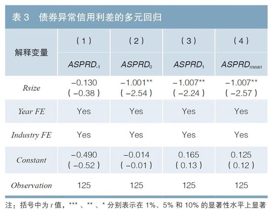 具体来说,本文将估计窗口由[-6,-3]改为[-3,-1],即定向增发股票公告的前3个月至前1个月,事件窗口则选择定向增发股票公告的当月及次月,即[0,1],然后在此基础上重新计算定向增发导致的债券异常信用利差,具体结果见表4。其中,面板A显示在公告发布的当月、次月及二者的均值全部显著为负,在面板B中定向增发规模Rsize则均在1%的显著性水平下为负,这表明前文结论仍然成立,意味着事件窗口的选取并未对研究结论产生重要影响。