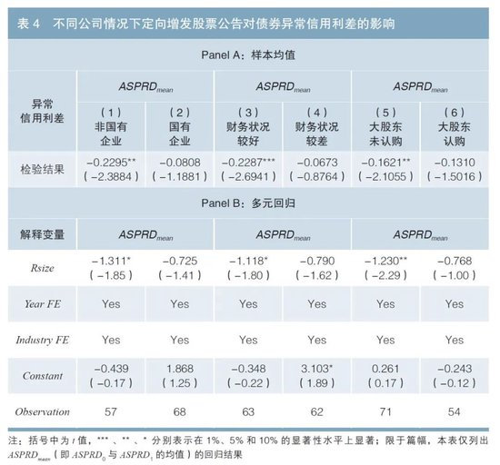表4面板B的第(3)(4)列显示了对于不同财务状况的公司,债券市场对其定向增发反应的回归结果。由实证结果可知,对于财务状况较好的公司,定向增发规模对债券异常信用利差的影响显著为负;对于财务状况较差的公司,定向增发规模对债券异常信用利差的影响不显著。这说明面对定向增发可能带来的业绩下滑、财务困境加剧等风险,财务状况良好的公司具备较强的抗风险能力,可以更好地抵抗风险,所以此类公司的债券持有人对定向增发效果持较好预期,定向增发规模对债券异常信用利差的影响更显著。