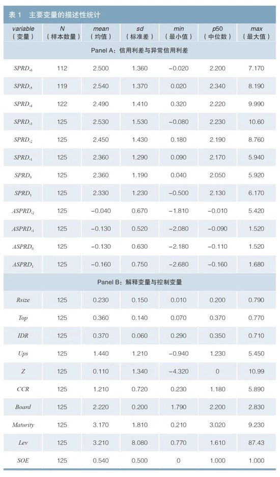 另外,为缓解反向因果问题,本文对主要解释变量和公司层面控制变量进行滞后一期处理。本文主要关注的系数是β1,若β2显著为负,则说明现定向增发股票的规模越大,债券异常信用利差越低,这将进一步支持假设H1a成立。