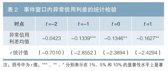 参考相关研究(Adams等,2009;Shi等,2020),本文使用常均值模型,即计算估测窗口[-6,-3]的信用利差均值,作为事件窗口[-2,1]信用利差的正常值E(SPRD)i: