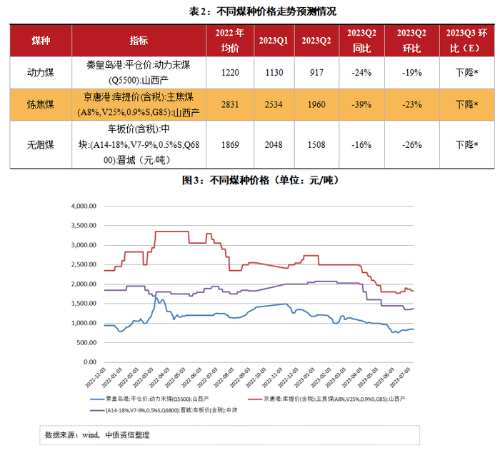 三季度以来,随着逐步进入夏季用电高峰,煤价从六月下旬开始止跌反弹,截至2023年7月11日,秦皇岛动力末煤(Q5500)平仓价由今年以来最低点759元/吨回升至848元/吨,考虑到虽然即将进入夏季用电高峰,钢铁、水泥等需求预计仍将下降,且电厂库存均处于高位,可能压制反弹程度,预计三季度动力煤价格整体呈现先涨后跌趋势,价格中枢较上季度仍将下降;炼焦煤,三季度进口仍将处于高位,需求端受下游钢铁行业景气度较低影响,需求仍较弱,预计价格仍将有所下行。无烟煤市场供应仍较为充足,下游化工开工率预计仍偏弱运行,预计价格环比下行。