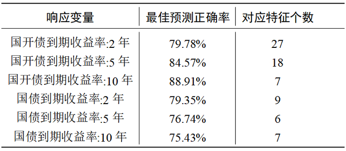 对于5年期和10年期的国开债,以及2年期、5年期、10年期的国债,我们的模型在合适的参数选取下也能超过 75% 的正确率。