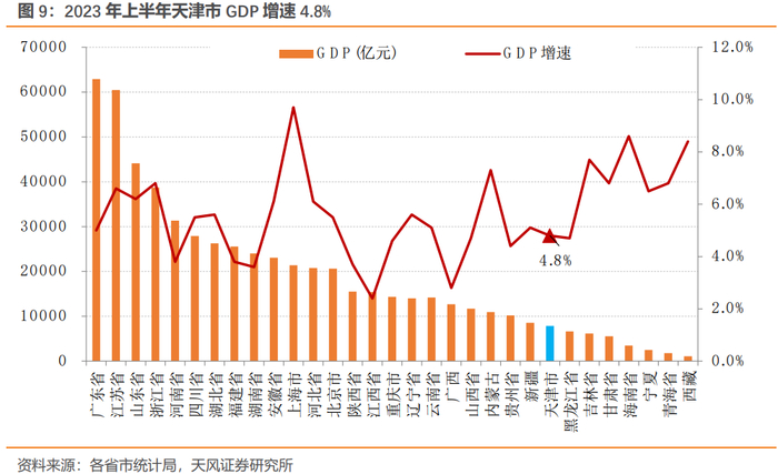 上半年,天津市GDP同比增长4.8%,处于全国中游水平。2023年上半年,全国实现GDP同比增长5.5%,天津增速略低于全国增速,处于全国中游偏下水平。