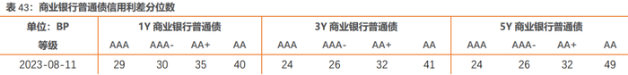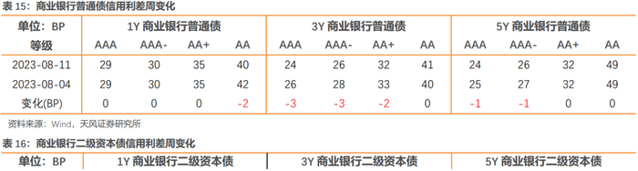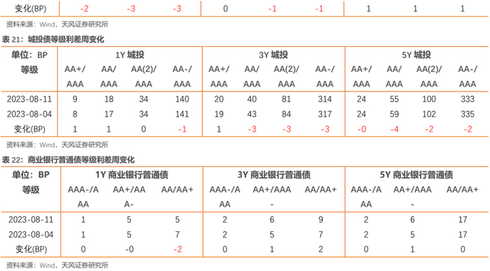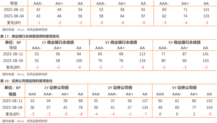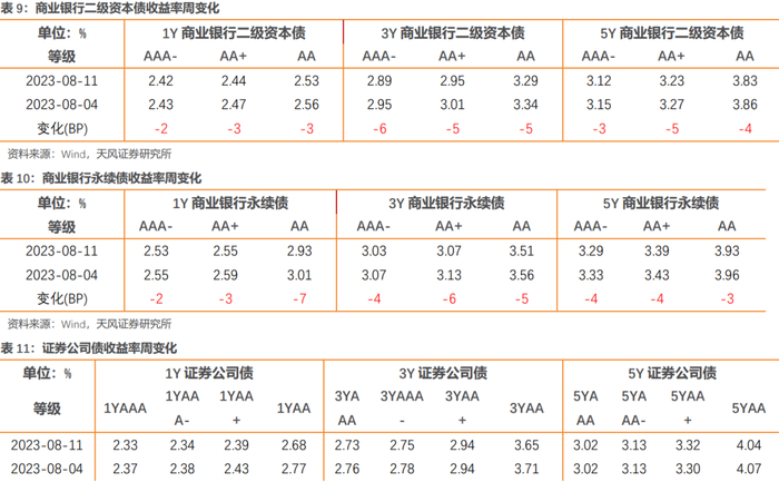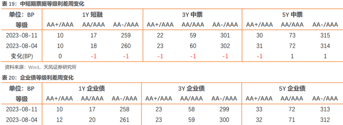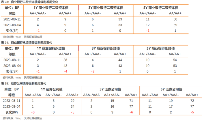 各类金融债等级利差涨跌互现。商业银行普通债收益率曲线1年期AAA-较AAA、AA+较AAA-、AA较AA+等级利差变动-2-0BP,3年期AAA-较AAA、AA+较AAA-、AA较AA+等级利差扩大0-2BP,5年期AAA-较AAA、AA+较AAA-、AA较AA+等级利差扩大0-1BP;商业银行二级资本债收益率曲线1年期AA+较AAA-、AA较AA+等级利差缩小-1-0BP,3年期AA+较AAA-、AA较AA+等级利差扩大0-1BP,5年期AA+较AAA-、AA较AA+等级利差变动-1-1BP;商业银行永续债收益率曲线1年期AA+较AAA-、AA较AA+等级利差缩小1-4BP,3年期AA+较AAA-、AA较AA+等级利差变动-2-1BP,5年期AA+较AAA-、AA较AA+等级利差扩大0-1BP;证券公司债收益率曲线1年期AAA-较AAA、AA+较AAA-、AA较AA+等级利差缩小-5-0BP,3年期AAA-较AAA、AA+较AAA-、AA较AA+等级利差变动-6-3BP,5年期AAA-较AAA、AA+较AAA-、AA较AA+等级利差变动-5-2BP。