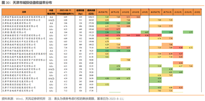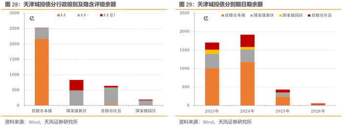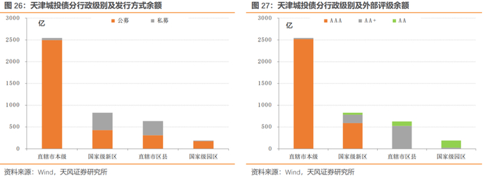 3、隐含评级偏低。天津城投中,仅津城建、轨交等少数几家隐含评级为AA,其他均低于AA评级。