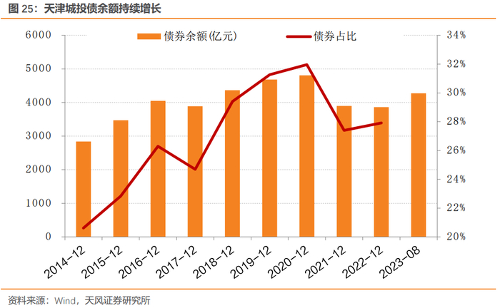 2022年以来,津城建等企业的债券募集资金能够用于偿还到期债务利息,天津城投债市场规模恢复增长。截止2023年8月11日,存量城投债规模达到4200亿元左右,在存量有息负债中的占比为27.9%。
