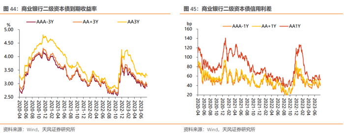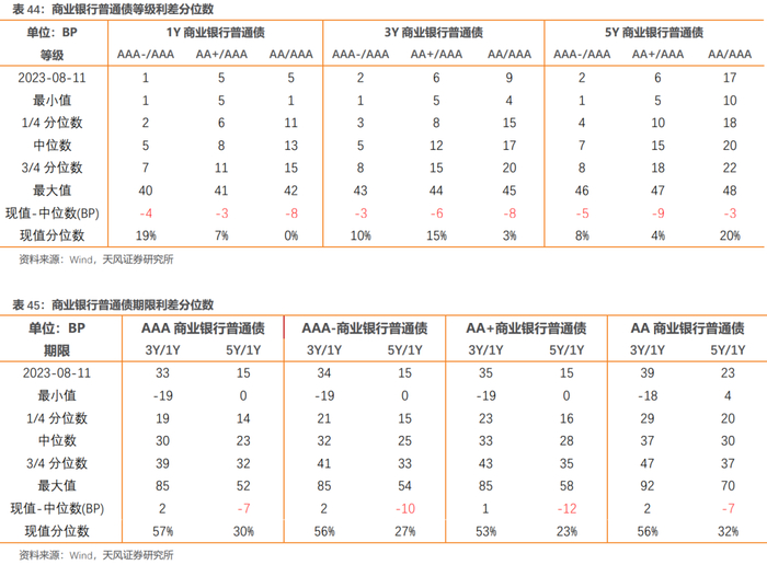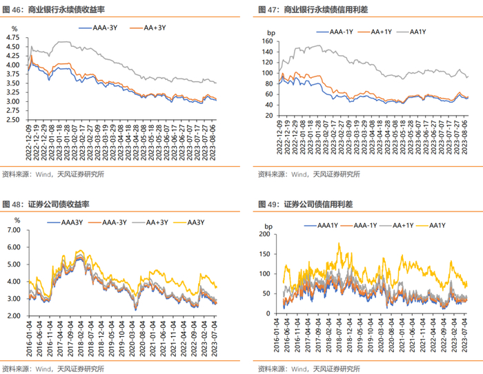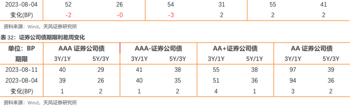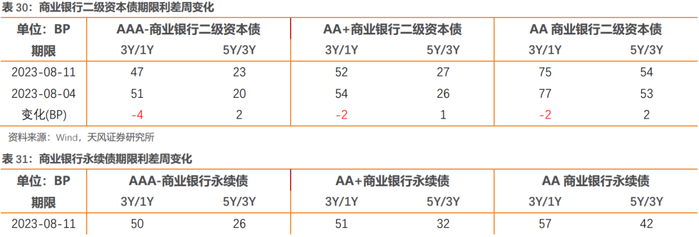 金融债期限利差部分扩大,部分缩小。具体来看,商业银行普通债收益率曲线AAA等级3Y/1Y和5Y/3Y的期限利差变动-2-0BP,AAA-等级的期限利差变动-2-0BP,AA+等级的期限利差变动-1-0BP,AA等级的期限利差变动-2-3BP;商业银行二级资本债收益率曲线AAA-等级3Y/1Y和5Y/3Y的期限利差变动-4-2BP,AA+等级的期限利差变动-2-1BP,AA等级的期限利差变动-2-2BP;商业银行永续债收益率曲线AAA-等级3Y/1Y和5Y/3Y的期限利差缩小-2-0BP,AA+等级的期限利差变动-3-2BP,AA等级的期限利差扩大2BP;证券公司债收益率曲线AAA等级3Y/1Y和5Y/3Y的期限利差扩大1-2BP,AAA-等级的期限利差扩大1-2BP,AA+等级的期限利差扩大1-4BP,AA等级的期限利差扩大2-3BP。