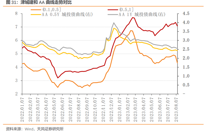 多重因素推动下,天津城投债一级融资难度降低,二级市场估值大幅下行。8月4日-11日一周时间内,津城建剩余期限0.1~0.5年的债券收益率下行51bp,剩余期限0.5-1年的债券收益率下行26bp。