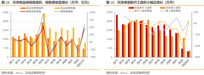 此外,基本面也同样在改善。上半年天津GDP实现4.8%的增长,虽然不高,但一般预算收入同比增长23.9%,土地出让收入增长303.7%,可用财力应该能实现明显增长。房地产市场有亮点,也有压力。房地产销售同比增长58.6%,销售面积同比增长46.2%,实现销售额1120.9亿元,表现亮眼。但房地产库存、二手房价走低仍有一定压力。