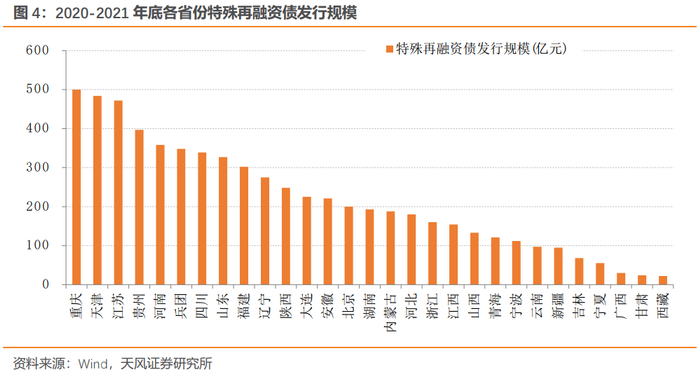 天津特殊再融资债持续享受政策支持,预计此次也将享受政策红利。剔除为了冲刺隐债清零而发行的特殊再融资债外,各省份合计发行了6328亿具有托底性质的特殊再融资债,其中,重庆、天津、江苏、贵州等省市发行规模居前,此次,预计天津还将享受政策红利。