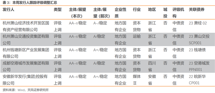 其中5(杭州萧山经济技术开发区国有资产经营有限公司、杭州萧山交通投资集团有限公司、杭州钱塘新区产业发展集团有限公司、成都空港城市发展集团有限公司、安徽新华发行(集团)控股有限公司)发行人评级被上调,无发行人评级被下调。