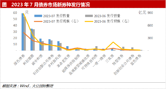 一、债市新券种发行方面,7月新券种发行数量和规模环比一升一降,绿色债券发行规模缩量较大是主因。7月债市共发行新券种151只,共募集资金1,104.47亿元,发行数量环比增长11.85%,发行规模环比下降38.13%。碳中和债、乡村振兴债等少数新券种发行规模环比增长,其他新券种环比均下降,其中绿色债券和科创票据发行规模环比降幅较大导致整体发行规模下降。7月发行革命老区债7只,发行数量创2022年以来单月最高值;一带一路债3只,发行数量为近期较高值。