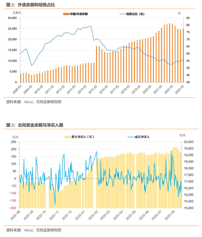 汇率超调的影响在于我们的外债余额并不低,短债占比从2021年下半年以来有上升趋势,汇率超调有可能加重外部均衡压力。