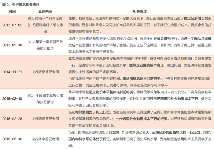 从历史的角度,我们梳理了2012年以来央行历次降息之后的答记者问、新闻发布会、货币政策执行报告,央行降息原因有以下几点: