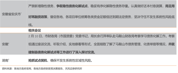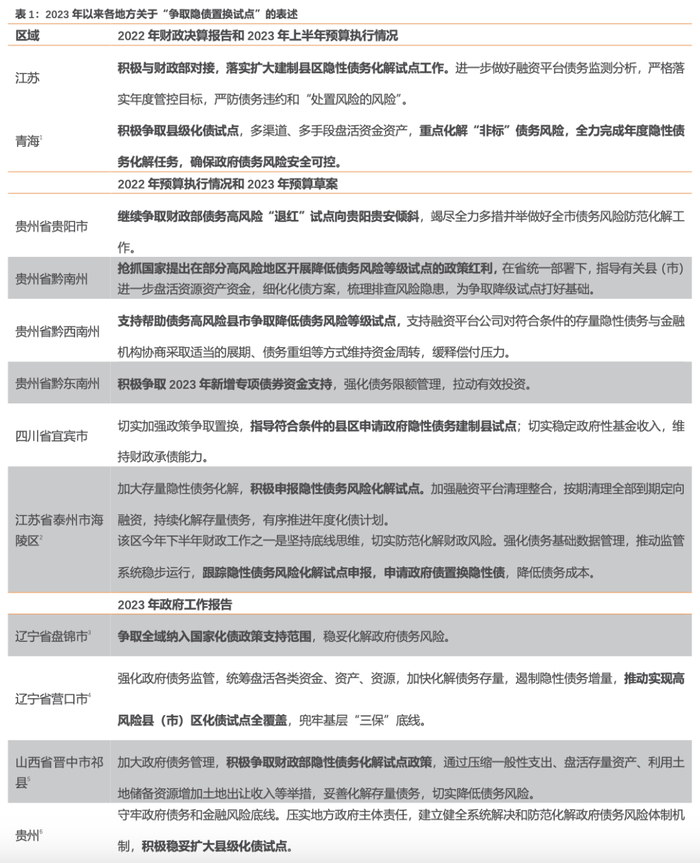 今年以来,多个省份及地市积极探索多渠道化解存量隐性债务,其中备受关注的是向上级寻求更多支持和重视,较多区域在最新财政预决算报告中,出现“争取高风险地区降低债务风险试点”、“申请政府债置换隐性债”的类似表述。