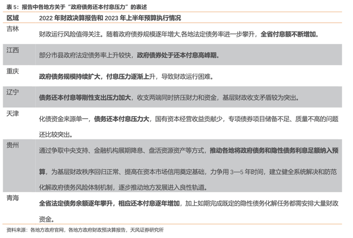 从政府债务还本付息来看,部分地区还提及政府债务上升较快,还本付息压力加大了财政运行压力。青海、吉林、江西、天津、重庆等地在预算执行报告中指出,部分市县政府法定债务率上升较快,政府债券处于还本付息高峰期,全省付息额不断增加,化解存量隐性债务任务较重;贵州提出“推动各地将政府债务利息足额纳入预算”。