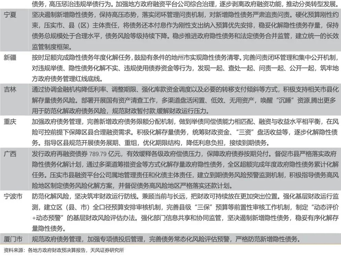 自年初以来,各地政府已制定隐性债务年度化解任务与化解工作方案,通过预算安排、资产变现等方式,多渠道筹措资金化解存量隐性债务。对于下半年财政工作,多地纷纷强调,将加大化解力度,确保按期完成年度化解任务。