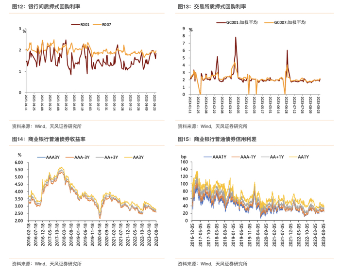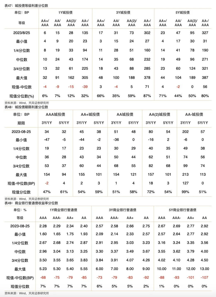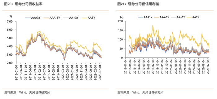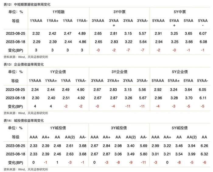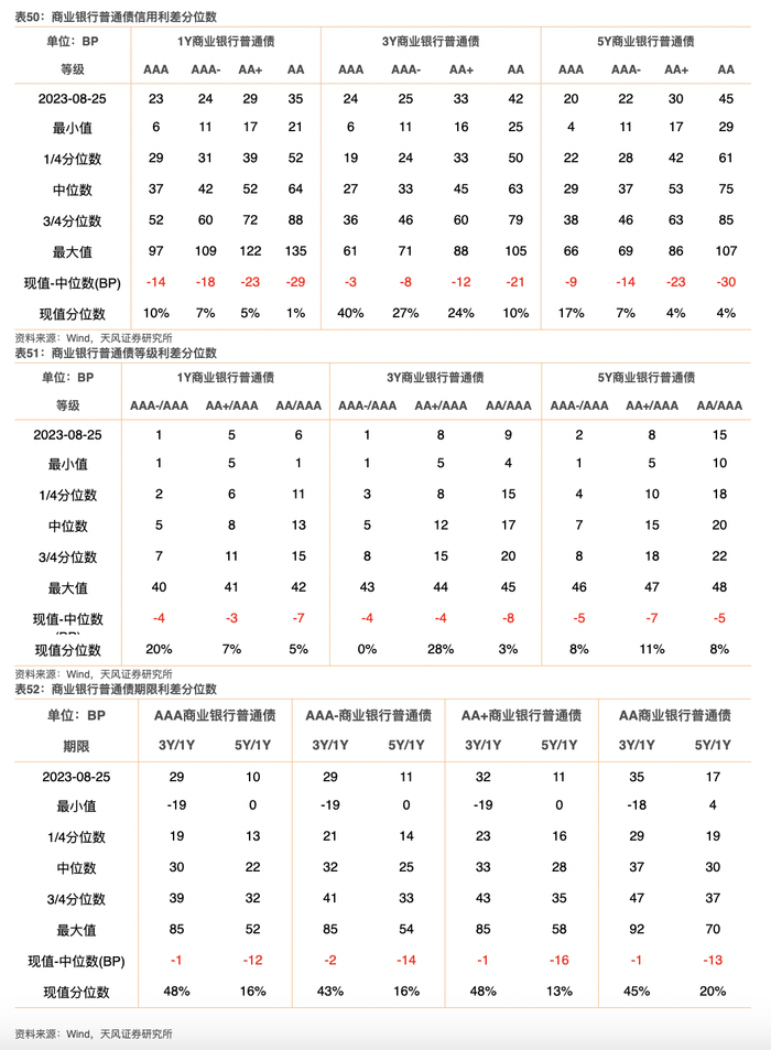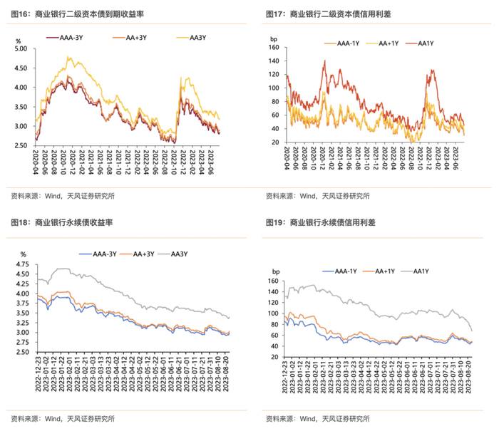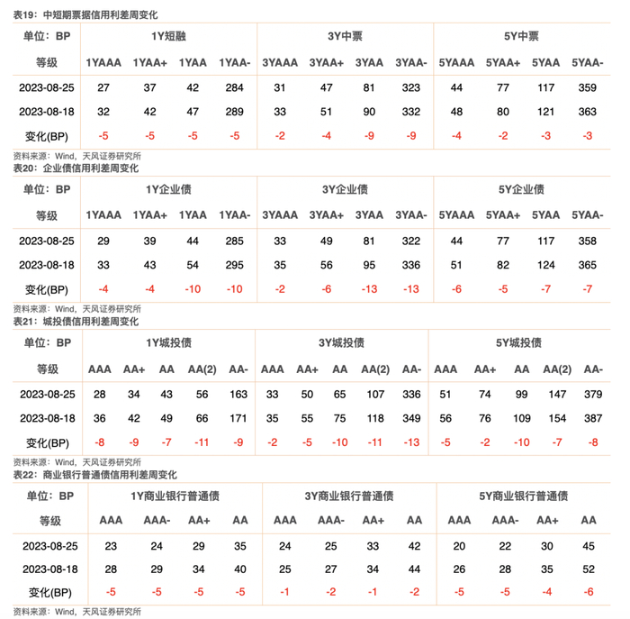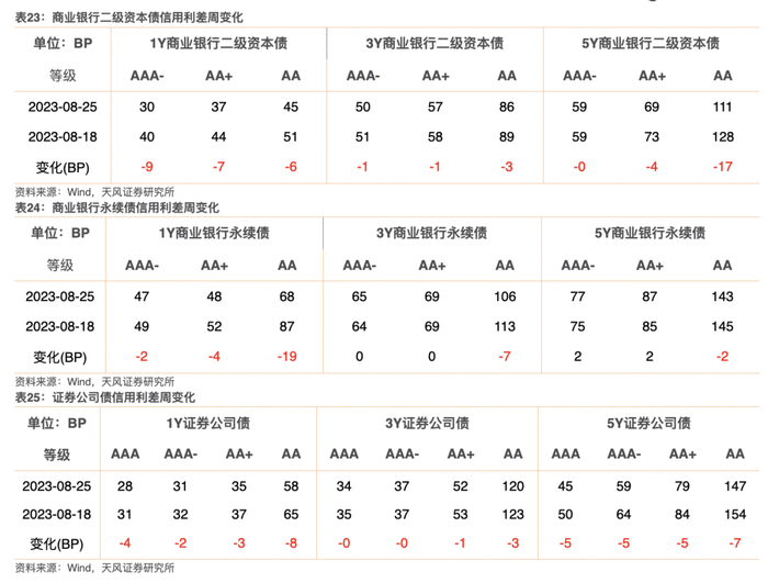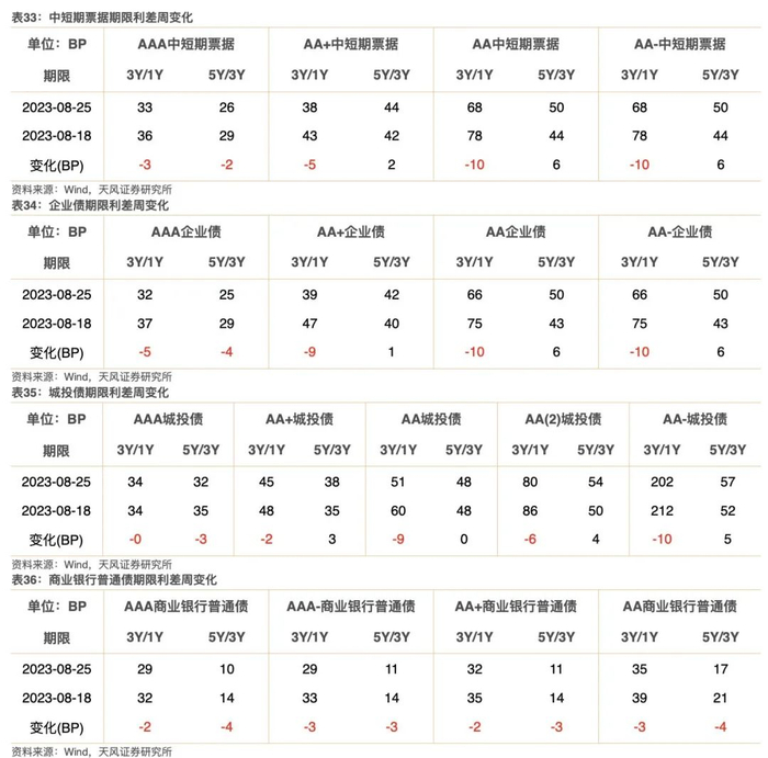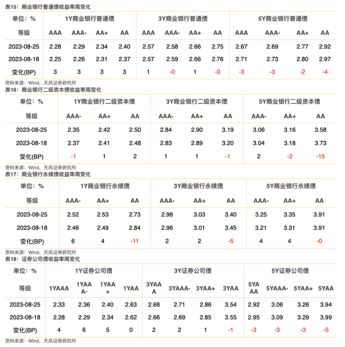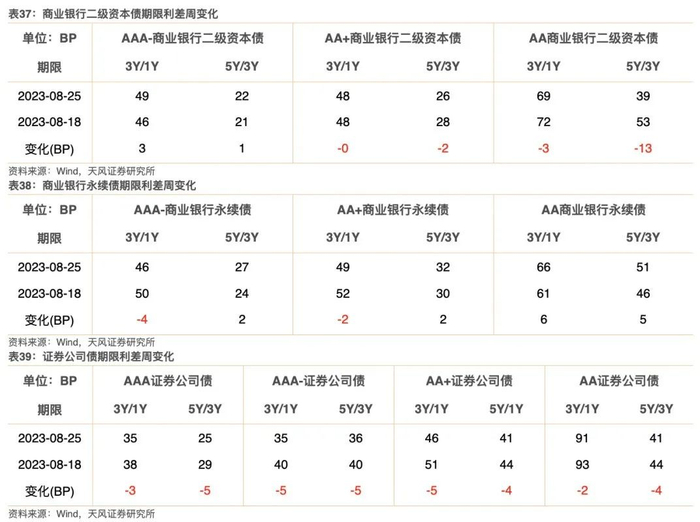 金融债期限利差部分扩大,部分缩小。具体来看,商业银行普通债收益率曲线AAA等级3Y/1Y和5Y/3Y的期限利差缩小2-4BP,AAA-等级的期限利差缩小3BP,AA+等级的期限利差缩小2-3BP,AA等级的期限利差缩小3-4BP;商业银行二级资本债收益率曲线AAA-等级3Y/1Y和5Y/3Y的期限利差扩大1-3BP,AA+等级的期限利差缩小0-2BP,AA等级的期限利差缩小3-13BP;商业银行永续债收益率曲线AAA-等级3Y/1Y和5Y/3Y的期限利差变动-4-2BP,AA+等级的期限利差变动-2-2BP,AA等级的期限利差扩大5-6BP;证券公司债收益率曲线AAA等级3Y/1Y和5Y/3Y的期限利差缩小3-5BP,AAA-等级的期限利差缩小-5BP,AA+等级的期限利差缩小4-5BP,AA等级的期限利差缩小2-4BP。