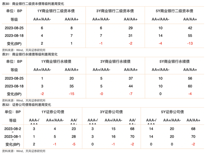 各类金融债等级利差涨跌互现。商业银行普通债收益率曲线1年期AAA-较AAA、AA+较AAA-、AA较AA+等级利差变动0-0BP,3年期AAA-较AAA、AA+较AAA-、AA较AA+等级利差变动-1-1BP,5年期AAA-较AAA、AA+较AAA-、AA较AA+等级利差变动-2-1BP;商业银行二级资本债收益率曲线1年期AA+较AAA-、AA较AA+等级利差扩大1-2BP,3年期AA+较AAA-、AA较AA+等级利差缩小1-2BP,5年期AA+较AAA-、AA较AA+等级利差缩小4-13BP;商业银行永续债收益率曲线1年期AA+较AAA-、AA较AA+等级利差缩小2-15BP,3年期AA+较AAA-、AA较AA+等级利差缩小0-7BP,5年期AA+较AAA-、AA较AA+等级利差缩小0-4BP;证券公司债收益率曲线1年期AAA-较AAA、AA+较AAA-、AA较AA+等级利差变动-5-2BP,3年期AAA-较AAA、AA+较AAA-、AA较AA+等级利差缩小0-2BP,5年期AAA-较AAA、AA+较AAA-、AA较AA+等级利差变动0-2BP。