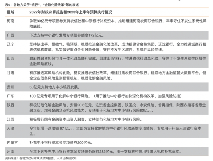 多个地方如贵州、天津、广西、河南、内蒙古等提到了“支持银行补充资本”,积极整合金融资源,因为协调金融机构减息置换存量债务后,银行面临资本补充的压力。不同省份补充银行资本的力度不一,内蒙古、广西、河南补充规模超150亿元。