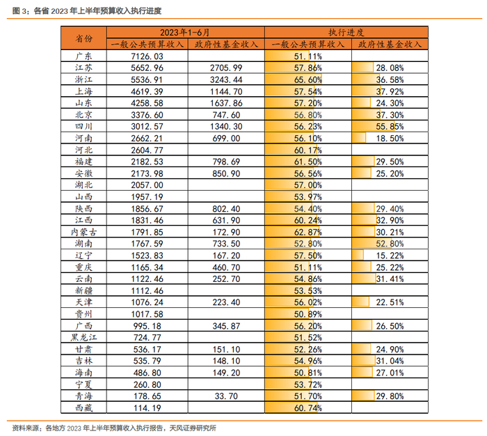 从2023年上半年预算收入执行情况来看,各省份一般公共预算收入进度均过半,主要是因为经济恢复性增长、上年受疫情及大规模留抵退税等因素基数较低,但整体增速放缓,后续财政收入压力仍然较大。