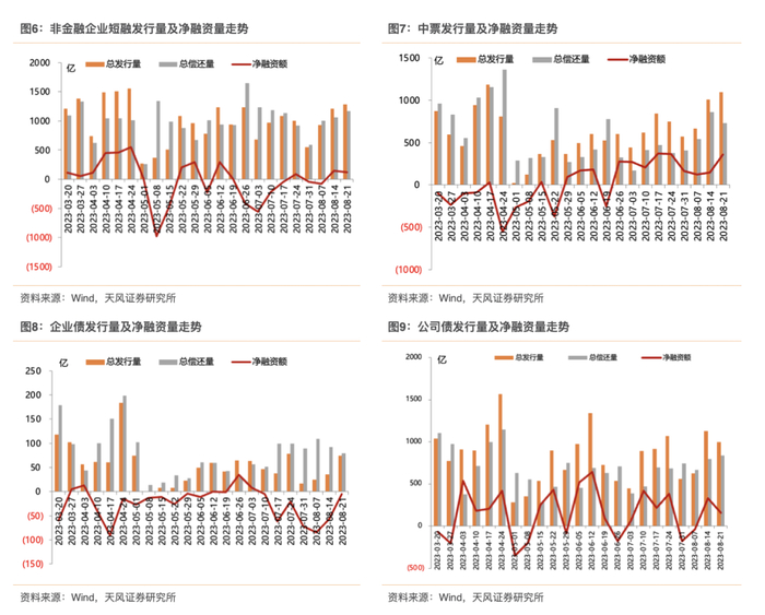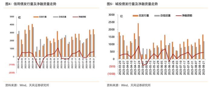 本周非金融企业短融、中票、企业债和公司债合计发行约3451.22亿元,总发行量较上周上升,偿还规模约2817.34亿元,净融资额约633.88亿元;其中,城投债(Wind分类)发行1657.47亿元,偿还规模约1205.62亿元,净融资额约451.85亿元;产业债发行2651.02亿元,偿还规模约2346.90亿元,净融资额约304.12亿元。