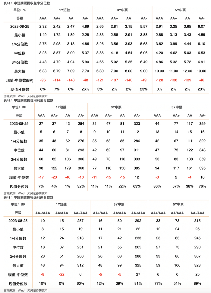 各类信用等级利差整体缩小,个别扩大。具体来看,中短期票据收益率曲线1年期AA+、AA和AA-较AAA等级利差缩小0BP,3年期等级利差缩小2-7BP,5年期等级利差扩大1-2BP;企业债收益率曲线1年期AA+、AA和AA-较AAA等级利差缩小0-6BP,3年期等级利差缩小4-11BP,5年期等级利差变动-1-1BP;城投债收益率曲线1年期AA+、AA和AA-较AAA等级利差变动-3-1BP,3年期等级利差缩小3-11BP,5年期等级利差变动-5-3BP。