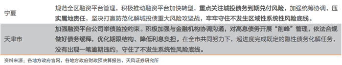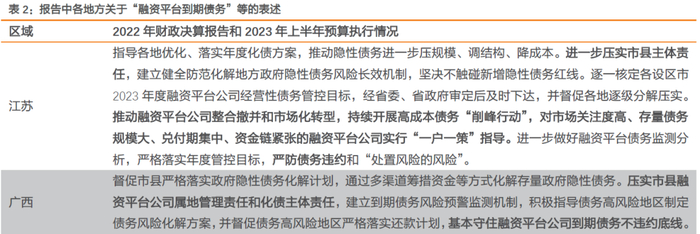 从各地方政府对于融资平台到期债务的态度来看,江苏、广西、重庆、天津等地强调压实市县融资平台公司的属地管理责任和化债主体责任,严防平台债务违约。