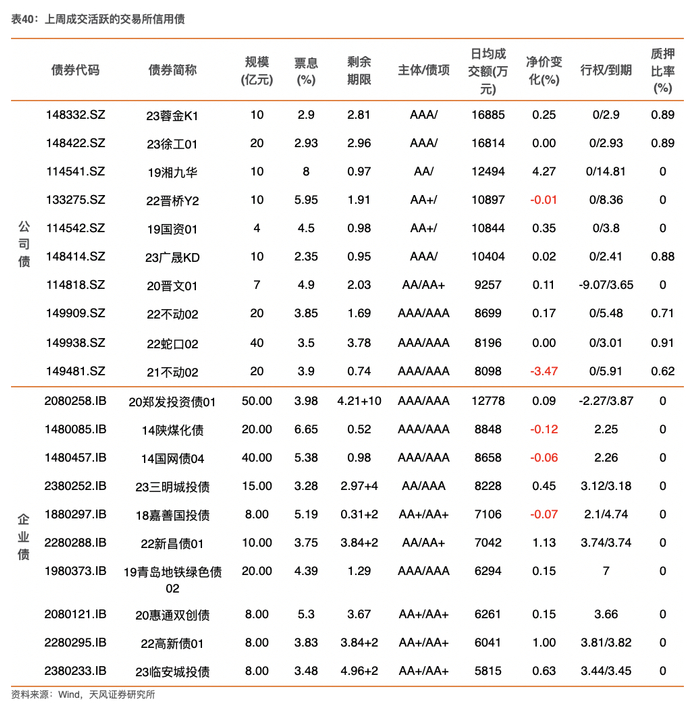 本周市场参与热情较高。有效投标倍数方面,0.74年期23滨建投SCP023以71.3倍发于3.5%,为全场最高,2年期23天津轨交MTN002以43.72倍发于4%,位列全场第二;利率偏差方面,0.49年期23昆明安居SCP003发行利率为7.5%,高于估值约525.15BP,0.73年期23宝城投SCP001发行利率为6.9%,高于估值约450.61BP。