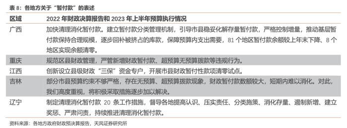 从暂付款问题来看,广西、吉林、辽宁等省份提到了加快“化解存量暂付款”,主要原因为暂付款会占用一部分地方政府财政资金。2018 年财政部发布《关于严格规范地方财政暂付性款项管理的通知》[1],要求严格控制暂付款增量,并要求2018年底前形成的暂付款项原则上应在2023年底前消化完毕。