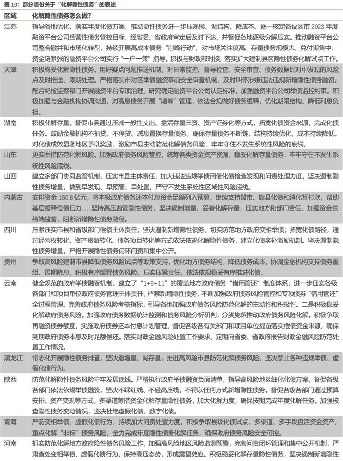 首先,针对隐性债务,“遏制增量、化解存量”仍是主线。自年初以来,各地政府已制定隐性债务年度化解任务与化解工作方案,通过预算安排、资产变现等方式,多渠道筹措资金化解存量隐性债务。对于下半年财政工作,多地纷纷强调,将加大化解力度,确保按期完成年度化解任务。