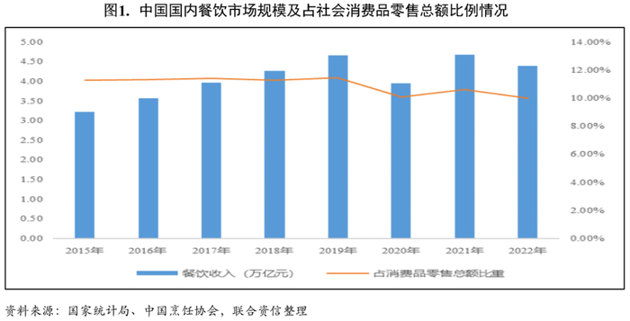 外卖,最初是指销售供顾客以打包形式带离店铺的食品,外卖行业属餐饮行业子行业。2019年之前,随着国内消费市场的发展,国内餐饮业保持不断增长态势,2020年,面对严峻复杂的国内外环境,餐饮业受到严重影响。根据中国烹饪协会发布《2020年中国餐饮市场分析及2021年市场前景预测》报告,2020年全国餐饮收入39527亿元,同比下降16.6%,餐饮市场连续多年的稳定增长势头戛然而止。2021年,消费市场稳步改善,消费需求不断释放,餐饮市场有所恢复。2021年全国餐饮收入46895亿元,与上年相比由负转为正增长18.6%,两年平均下降0.5%,还未恢复至2019年水平。全国餐饮收入占到社会消费品零售总额的10.6%,高于上年0.5个百分点,而且增速再次高于社会消费品零售总额增幅,领先优势扩大至6.1个百分点。2021年全国人均餐饮消费3320元,同比增速由负转正为18.6%。餐饮业继续发挥促进经济增长、带动消费回升的重要驱动作用。根据国家统计局发布数据显示,2022年,全年餐饮收入43941亿元,同比下降6.3%。整体看,国内餐饮市场规模占社会消费品零售总额的比重相对稳定,而在2020年及2022年,餐饮行业受外部环境影响的程度更大,对社会消费品零售总额贡献比重有所降低。