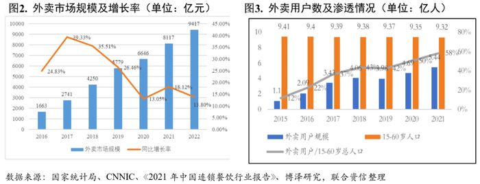 2020-2022年,随着复工复产以及促进消费的政策落地,经济社会发展取得积极成效,消费潜力不断释放,中国餐饮行业呈现复苏态势,发挥促进经济增长、带动消费回升的重要驱动作用。外卖行业作为餐饮行业子行业,依托电话、手机、网络的普及呈现高速发展的态势,渗透率不断提升。