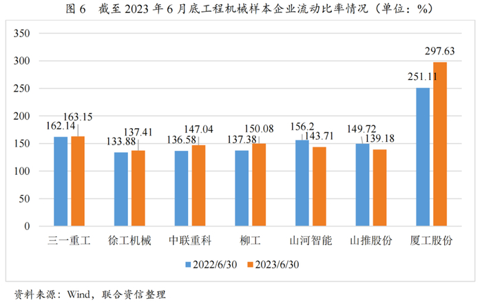 从资本结构和短期偿债能力来看,样本企业资产负债率整体处于正常水平,截至2023年6月底,除厦工股份外,样本企业的资产负债率较2022年6月底均有所增长;样本企业流动比率较2022年6月底在合理区间内波动,整体变动不大。