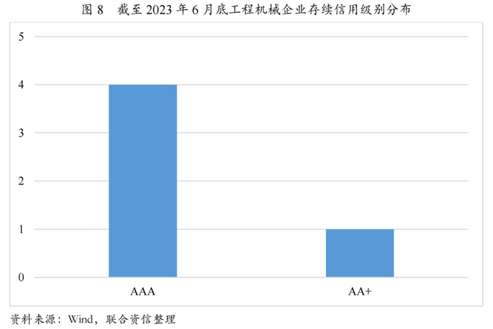 截至2023年6月底,具备有效主体信用等级的工程机械企业共5家,从主体信用等级分布看,信用等级为AA+的企业1家,其余4家企业的主体信用等级均为AAA。