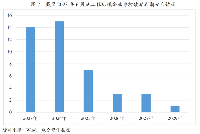截至2023年6月底,工程机械企业存续的信用债券共43支,债券余额合计236.66亿元。其中,于2023年到期的信用债券共14支(共84.11亿元),2024年到期的信用债券共15支(共83.31亿元),其余14支信用债券(共69.24亿元)到期日分布于2025年1月至2029年3月之间,存在一定集中偿付压力。
