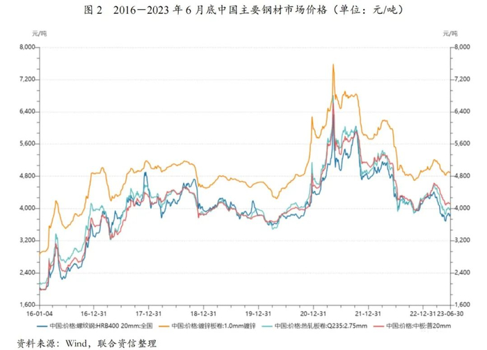 中国主要钢材价格方面,2016-2023年6月底,以每年年底为时间节点,中国螺纹钢(型号:HRB400 20mm)、镀锌板卷(型号:1.0mm镀锌)、热轧板卷(型号:Q235:2.75mm)和中板(型号:普20mm)的市场价格变动趋势同综合钢价指数走势趋同,整体呈波动增长态势;2023年1-6月呈“冲高回落”态势。截至2023年6月底,中国螺纹钢(型号:HRB400 20mm)、镀锌板卷(型号:1.0mm镀锌)、热轧板卷(型号:Q235:2.75MM)和中板(型号:普20mm)的市场价格分别为3855元/吨、4900元/吨、4003元/吨和4130元/吨,较2022年6月底分别下降12.13%、11.52%、11.81%和12.33%。