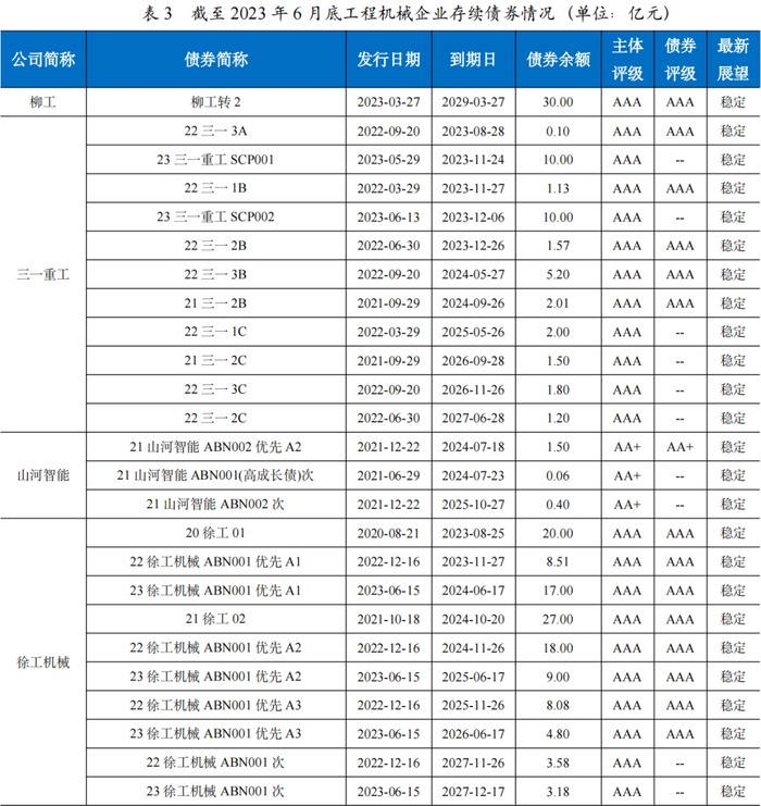 债券市场方面,2023年1-6月,工程机械行业内企业发行信用债券规模较上年同期有所下降;行业内企业整体运行情况良好,未发生违约、级别下调等情况;存续债券存在一定集中偿付压力。