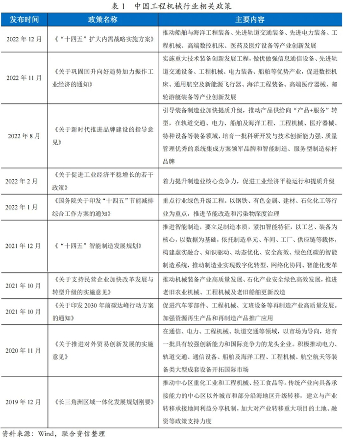 产业政策方面,近年来,我国颁布了一系列政策为工程机械行业发展提供了有利支持,具体政策如下表所示: