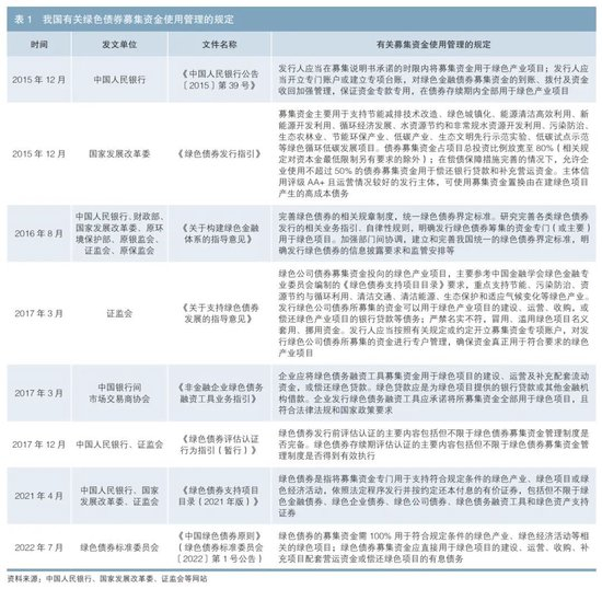 为加快推进美丽中国建设,全面深入贯彻新发展理念,引导金融机构服务绿色高质量发展,推动经济结构转型升级和经济发展方式转变,为我国绿色产业发展提供有力的金融支持,我国相关管理部门及机构自2015年起出台了一系列关于绿色债券发行、管理的文件,明确了绿色债券募集资金的用途管理(见表1)。