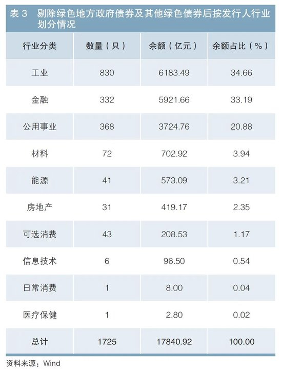 在剔除绿色地方政府债券及其他绿色债券后1,我国存量绿色债券余额约为1.78万亿元。按照万得(Wind)一级行业分类,募集资金主要投向工业、金融业、公用事业,3个行业的企业债券余额合计占88.73%,其中工业企业绿色债券余额为6183.49亿元,占比为34.66%;金融企业绿色债券余额为5921.66亿元,占比为33.19%;公用事业企业绿色债券余额为3274.76亿元,占比为20.88%(见表3)。