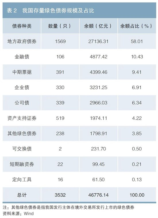 根据上述标准,截至2022年12月末,我国存量绿色债券余额约为4.68万亿元;按债券种类进行划分,规模占比位居前五的依次为地方政府债券、金融债、中期票据、企业债、公司债,占比分别为58.01%、10.43%、9.41%、6.91%、6.34%(见表2)。