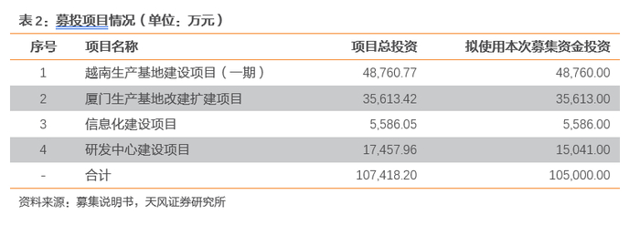 本次募投资金中4.9亿预计将用于越南生产基地建设项目(一期),3.6亿用于厦门生产基地改建扩建项目,0.56亿用于信息化建设项目,1.7亿用于研发中心建设项目。其中,越南生产基地建设项目(一期)是对越南子公司气袋生产线的进一步完善及扩充,将越南现有切割缝纫工序升级为完整工序的安全气囊袋生产线,实现越南地区本地化配套生产,提升产品生产效率和质量稳定性,缩短交货周期,充分利用越南人力成本、税收优惠等优势,构建安全气囊袋及OPW气囊袋的海外供应能力,输出公司先进技术及管理经验,推进公司全球化布局,提高全球市场占有率;厦门生产基地改建扩建项目拟提升市场前景较好的OPW气囊袋产能,并适当增加安全气囊布产能以匹配OPW的扩产,缓解相关产品的产能压力,同时完成智能生产、检测、仓储及物流体系建设,提升生产线自动化水平,降低公司人工成本,提升生产效率。