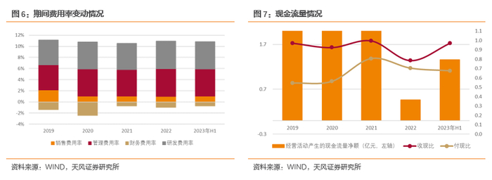 2023年H1公司销售费用率1.04%,较去年同期同比下降0.13pct;管理费用率11.34%,较去年同期同比下降5.08pct;财务费用率-0.7%,较去年同期同比增长0.06pct;研发费用率4.89%,较去年同期同比下降0.44pct。